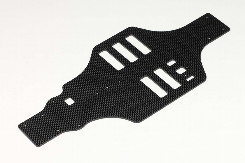 グラファイト製メインシャーシです。2.5mm厚の素材を使用し、剛性感のあるマシンに仕上がります。