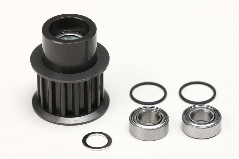 プーリー内部にワンウェイベアリングを挿入し、駆動時はロック、ブレーキ時にフリーに回転することで、旋回性を高めることのできるWorks’91 TeamSpec用のワンウェイプーリーです。専用のメインシャフト(YZ-631W1メインシャフト)と併せてお使いください。