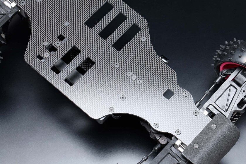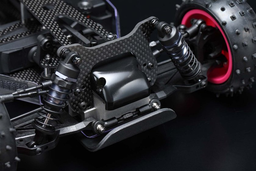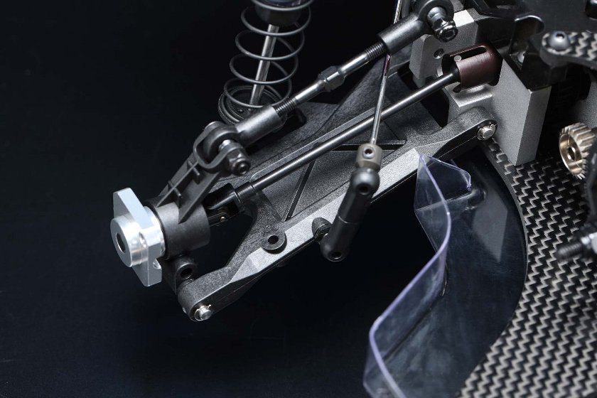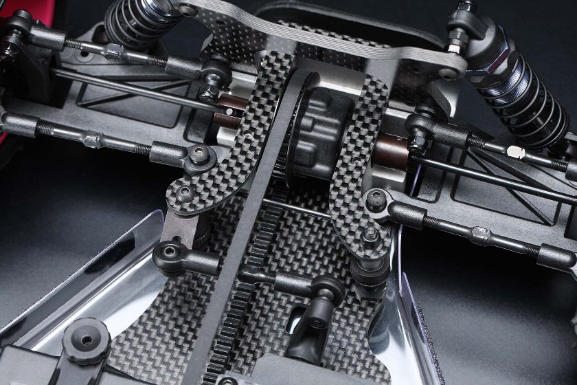 メインシャーシやショックタワーをグラファイト化、グラファイト製のステアリングポストプレート、リヤバルクスペーサーや、アルミ製アッパーデッキポストの追加など贅沢な装備で剛性アップを果たしています。さらにインナーサスピンのトルクロッドやスタビライザーの取り付け変更、リヤショックのロング化などで大幅に走破性が高まりました。