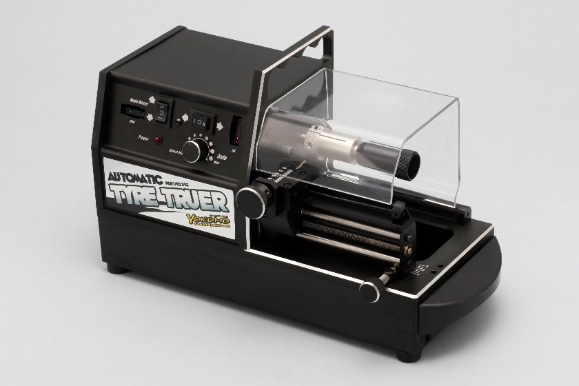 12分の1レーシング用などのスポンジタイヤを自動で径調整できるタイヤトゥルーアー。高機能ながらお求めやすい価格を実現いたしました。タイヤ径40mmから80mmまでを0.1mm刻みで設定できる精密アジャスター、ワンタッチでサンディング刃を自動送りするオートマチック機能で、精度の高いサンディングを楽に行うことが可能です。刃送りのスピードもバリアブルに調整でき、タイヤの種類に合わせて最適なサンディングが選べます。電源はパワーサプライDC13.8V、もしくは本体裏面に収納する7.4V×2本のストレートパックバッテリーを選択可能。