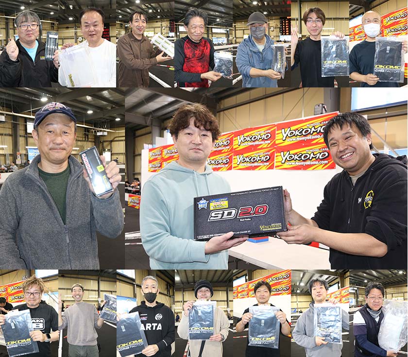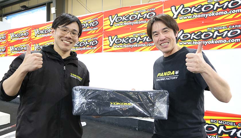 レースのインターバルにはチームヨコモのドライバーとヨコモ社員ドライバーで走行するエキジビジョンレースも開催。ハンディキャップを設けて優勝ドライバーを当てる投票を行いましたが、チームヨコモの姉川選手がトップゴール、そしてそれを見事に的中させたジリジリ選手が商品のマシンバッグをゲットしました。