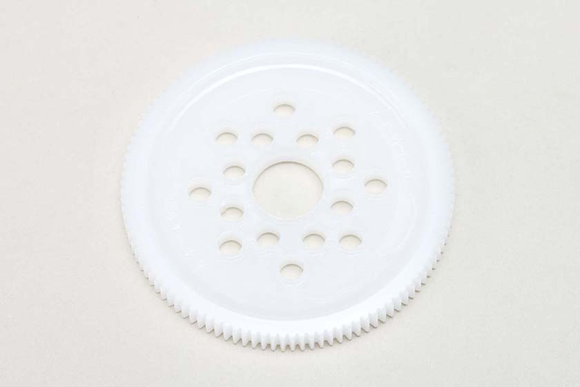 歯数108Tの高精度汎用スパーギヤ。ギヤの精度が高まることにより、駆動系の効率が上がります。ギヤの規格は64ピッチですので、同じ規格のピニオンギヤをご使用ください。