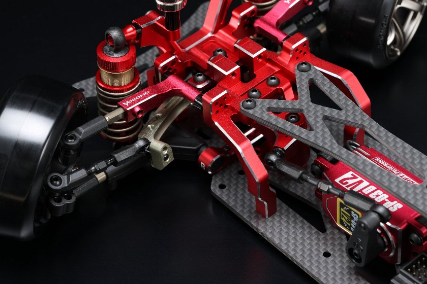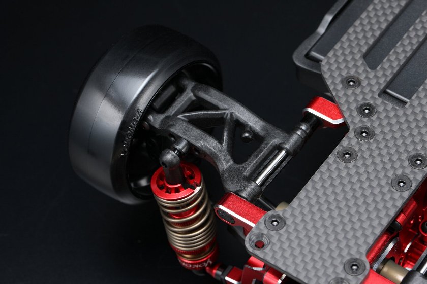 フロント周りでは剛性感によりフロントタイヤへの面圧を高め、コーナー脱出時などのコントロール性を引き出します。サスアームは前後共にサスピン式のHアームを採用して汎用性も高めています。
