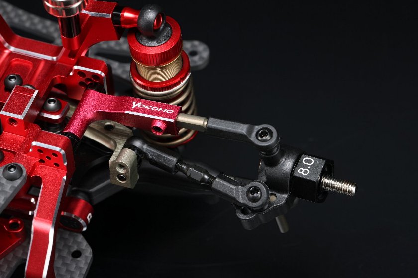 ステアリングにはスライドラックを採用。従来と同様にスペーサーを挟み込むことでスライドラック全体を前後に移動でき、アッカーマン比の設定がより細かくできる構造としている。