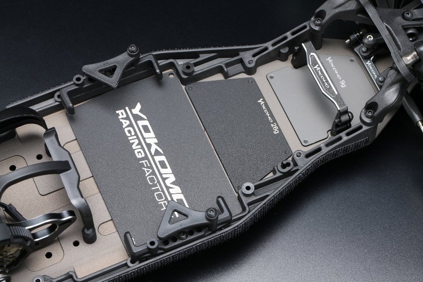 スチール製のバッテリープレートとメカトレイ、アルミ製のフロントシャーシウエイトを標準で装備していますので、ウエイトバランスを自由に変更できます。