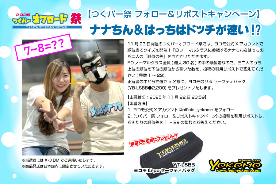 11月23日開催のつくパーオフロード祭では、ヨコモ公式Xアカウントで順位当てクイズを開催! ROノーマルクラスに参戦するナナちん&はっちのお二人の順位の差を当てていただきます。