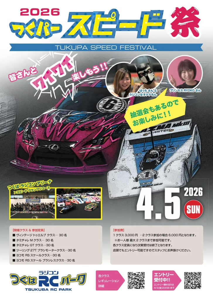 2026年4月5日、つくばラジコンパークのスピード・グランプリコースにてつくパースピード祭2026を開催します!様々な車両で6クラスが設定し、もちろんヨコモRSカテゴリーも2クラスでお楽しみいただけます。