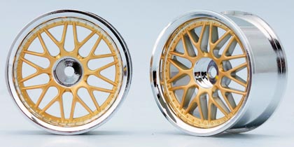 ドリフトパッケージに最適な10本メッシュホイール(ゴールド)。26mm幅、4mmオフセット。2本入り。